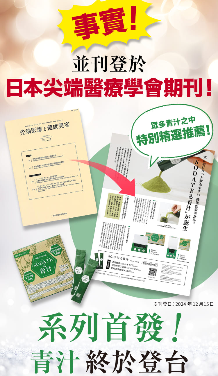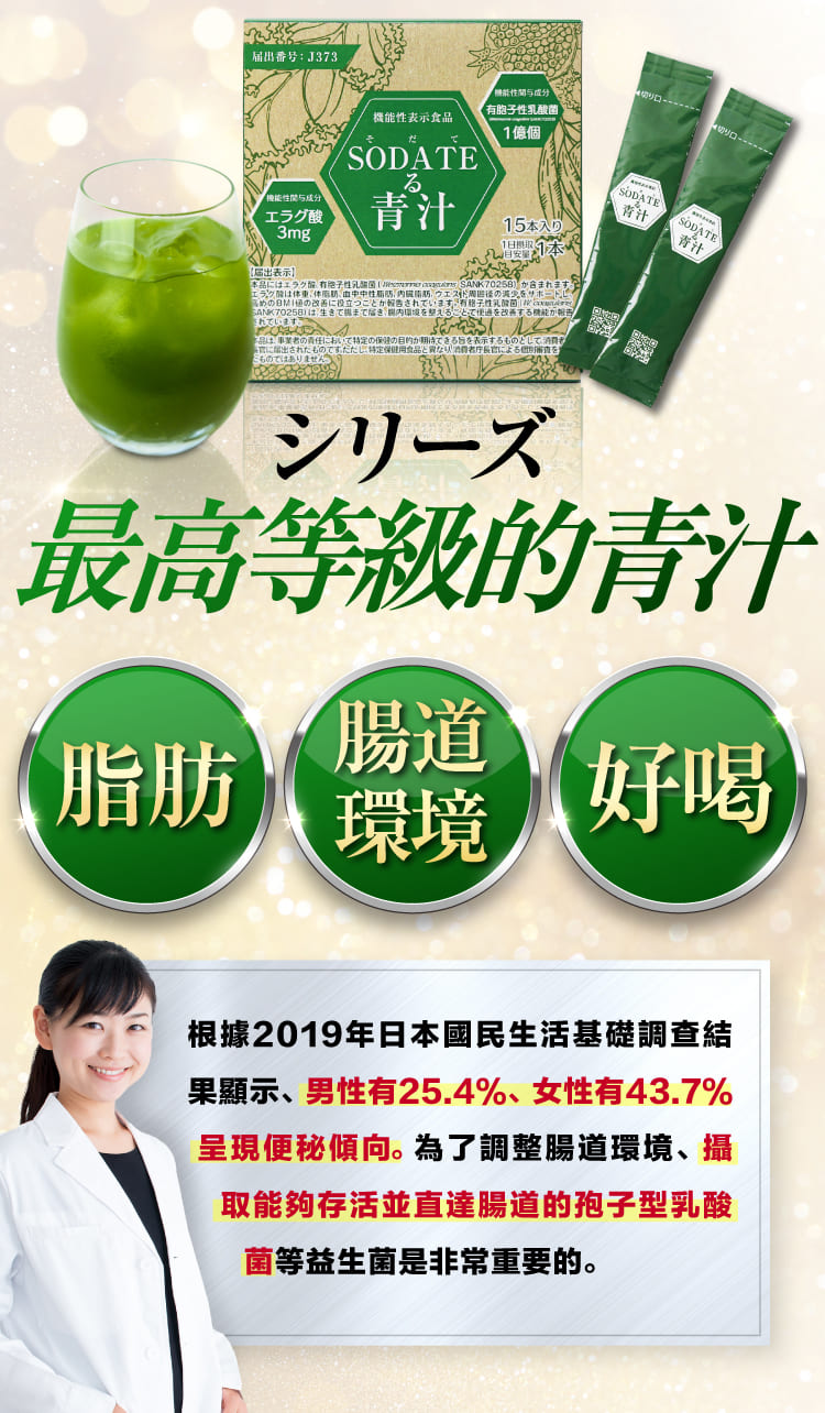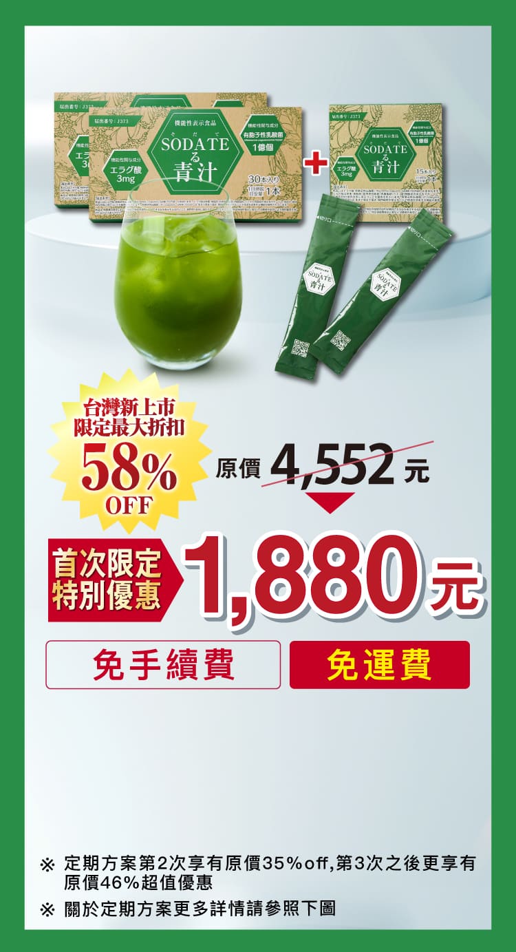 原料名稱:澱粉分解物(日本製造)、羽衣甘藍、綠球藻(小球藻)、孢子型乳酸菌(含乳成分)、石榴萃取/珊瑚鈣