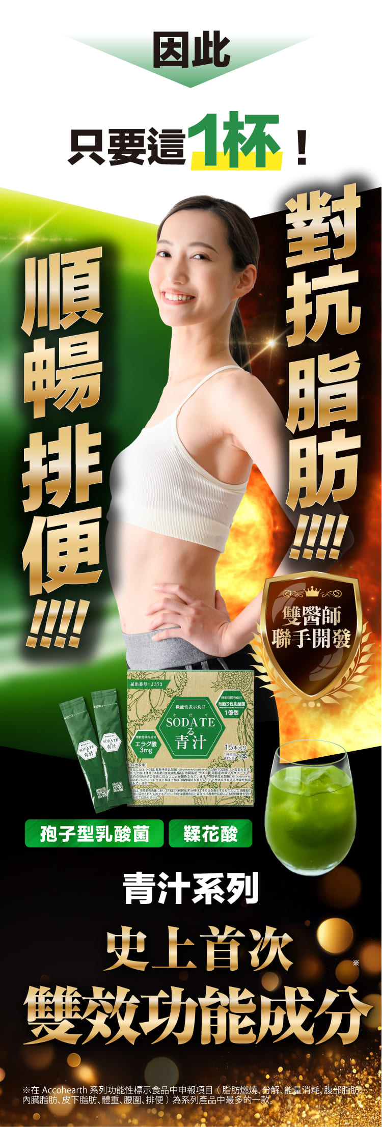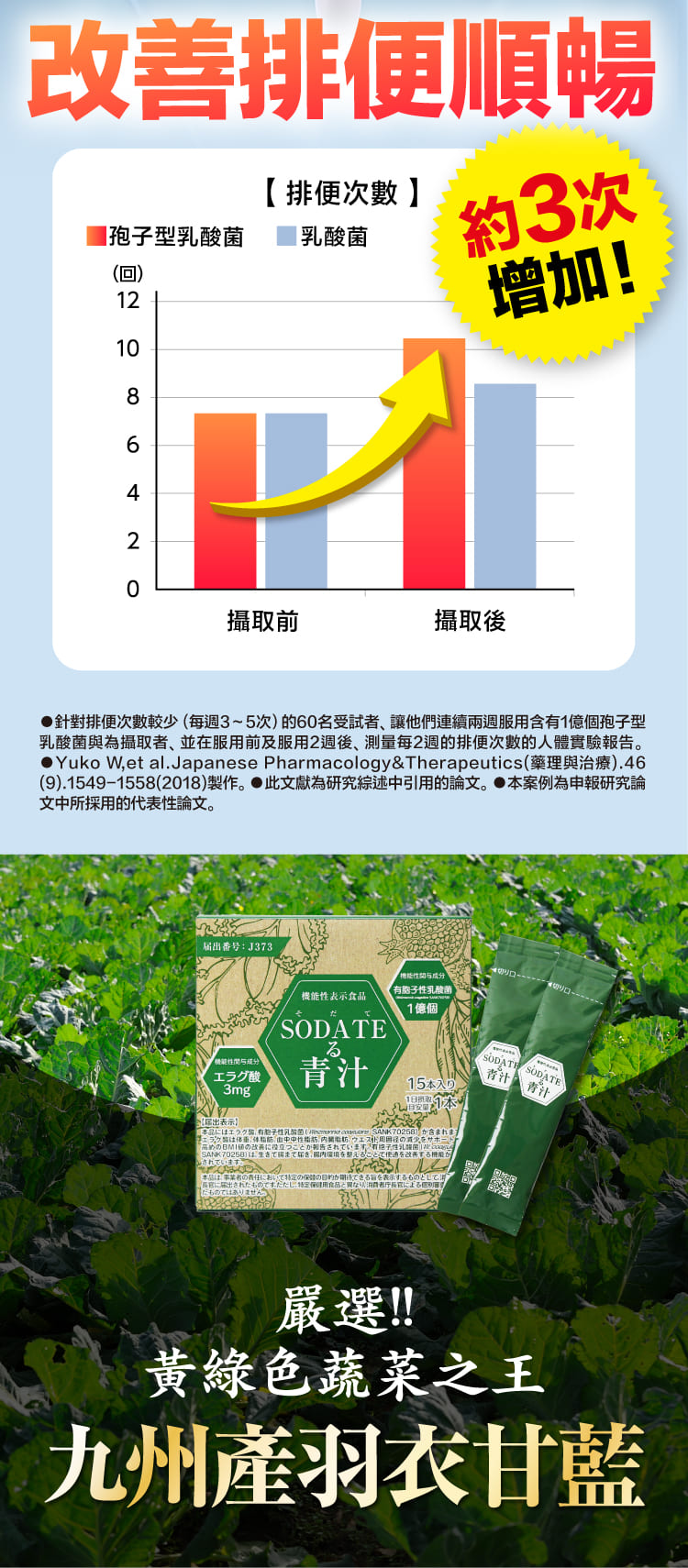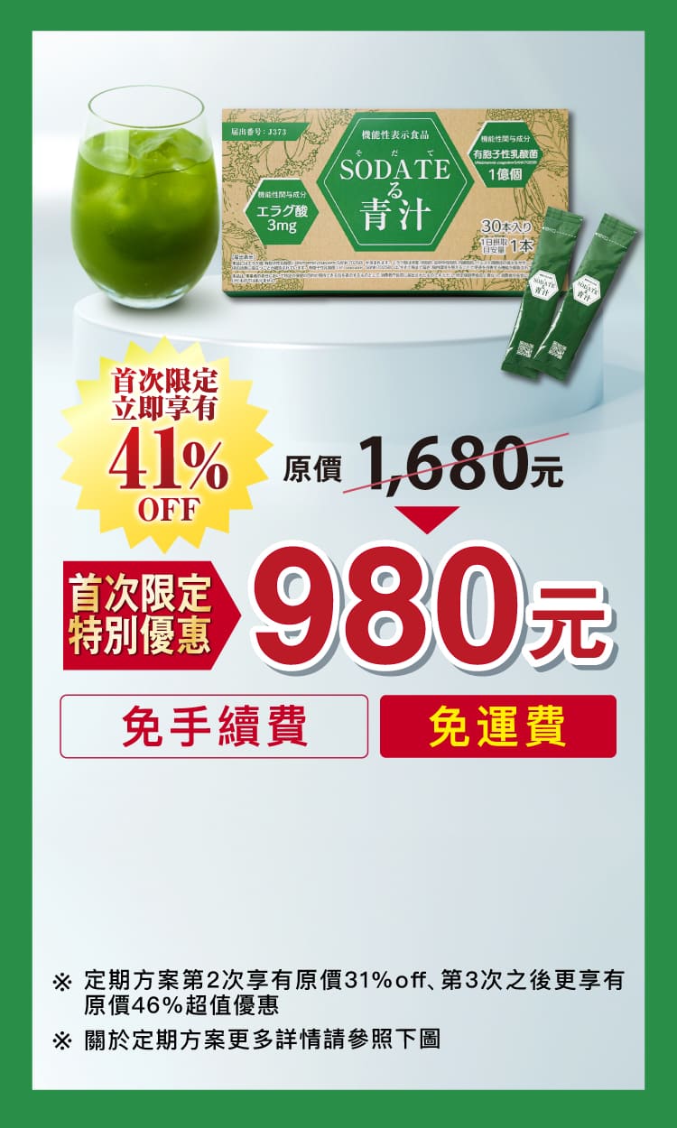 原料名稱:澱粉分解物(日本製造)、羽衣甘藍、綠球藻(小球藻)、孢子型乳酸菌(含乳成分)、石榴萃取/珊瑚鈣