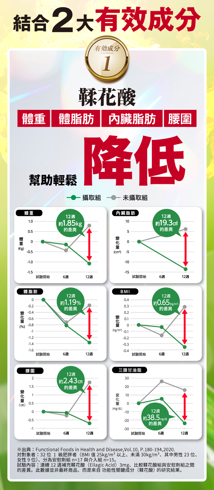 每1包(2.5公克)、熱量:9.28大卡、蛋白質:0.27公克、脂肪:0.06公克、碳水化合物:1.93公克、食鹽相當量:0.009公克/機能性關係成分(鞣花酸:3mg、孢子型乳酸菌:1億個)